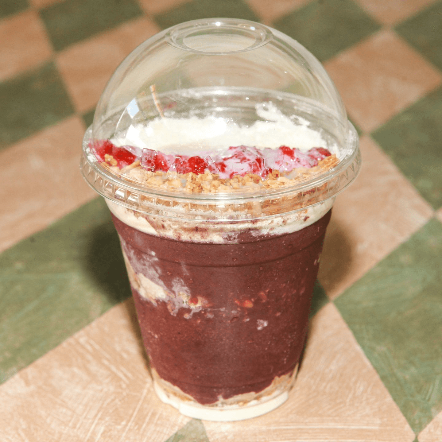 Topped with condensed milk, milk powder, granola, and strawberries
