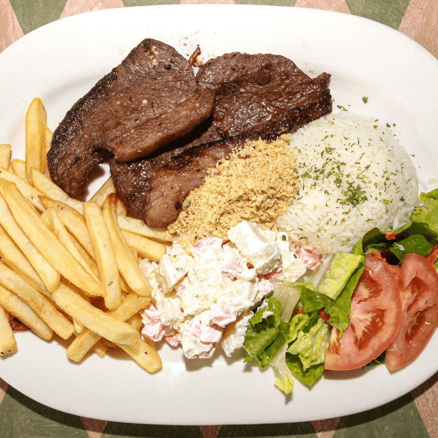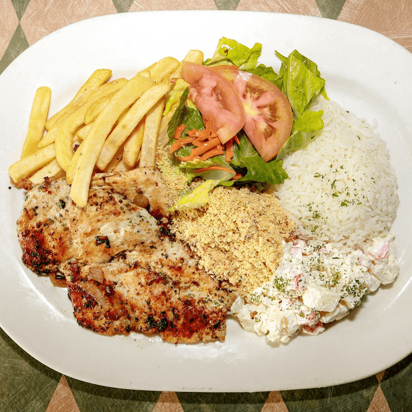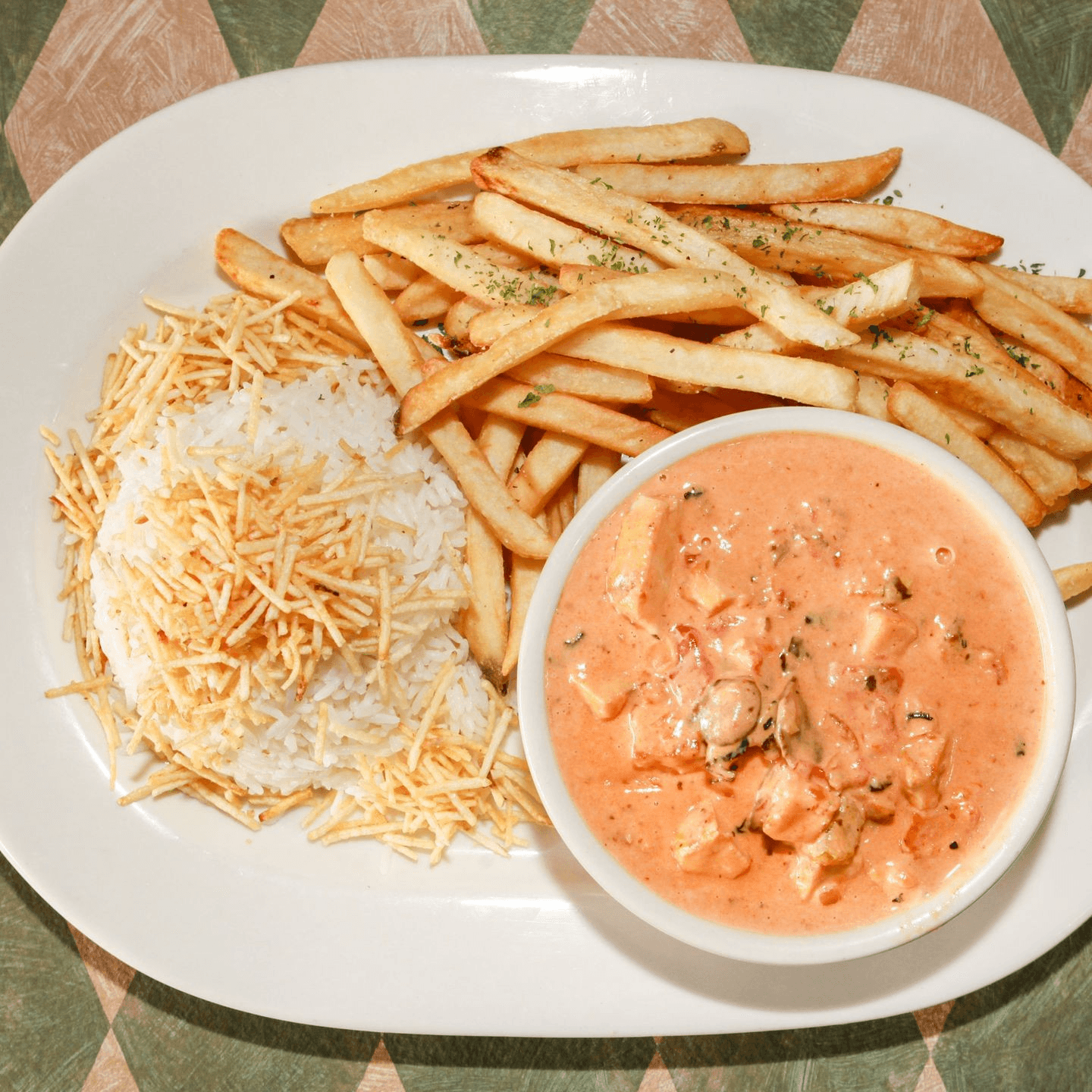 Tender chicken in a creamy sauce made with heavy cream, ketchup, mustard, and mushrooms. Served with rice, fries, and crispy shoestring potatoes. *Not served with beans, potato salad, mixed greens, or farofa.