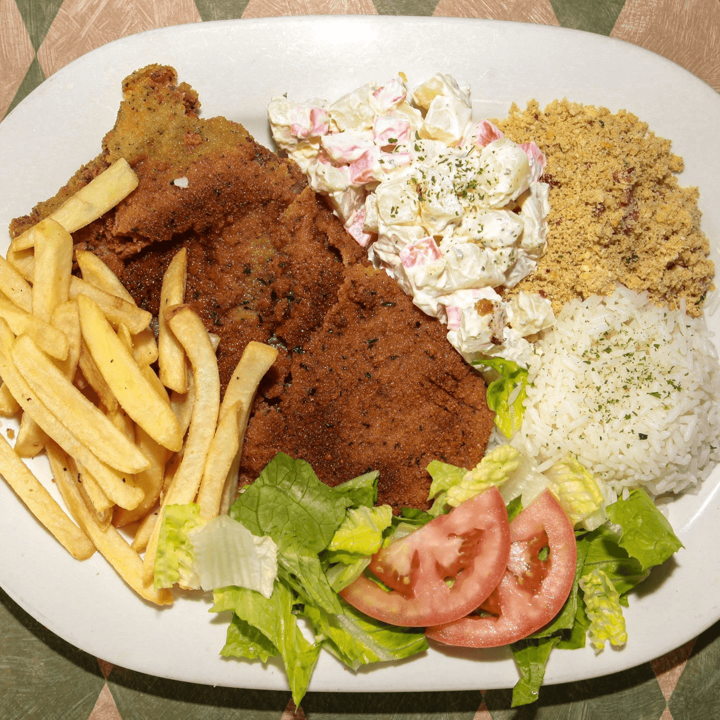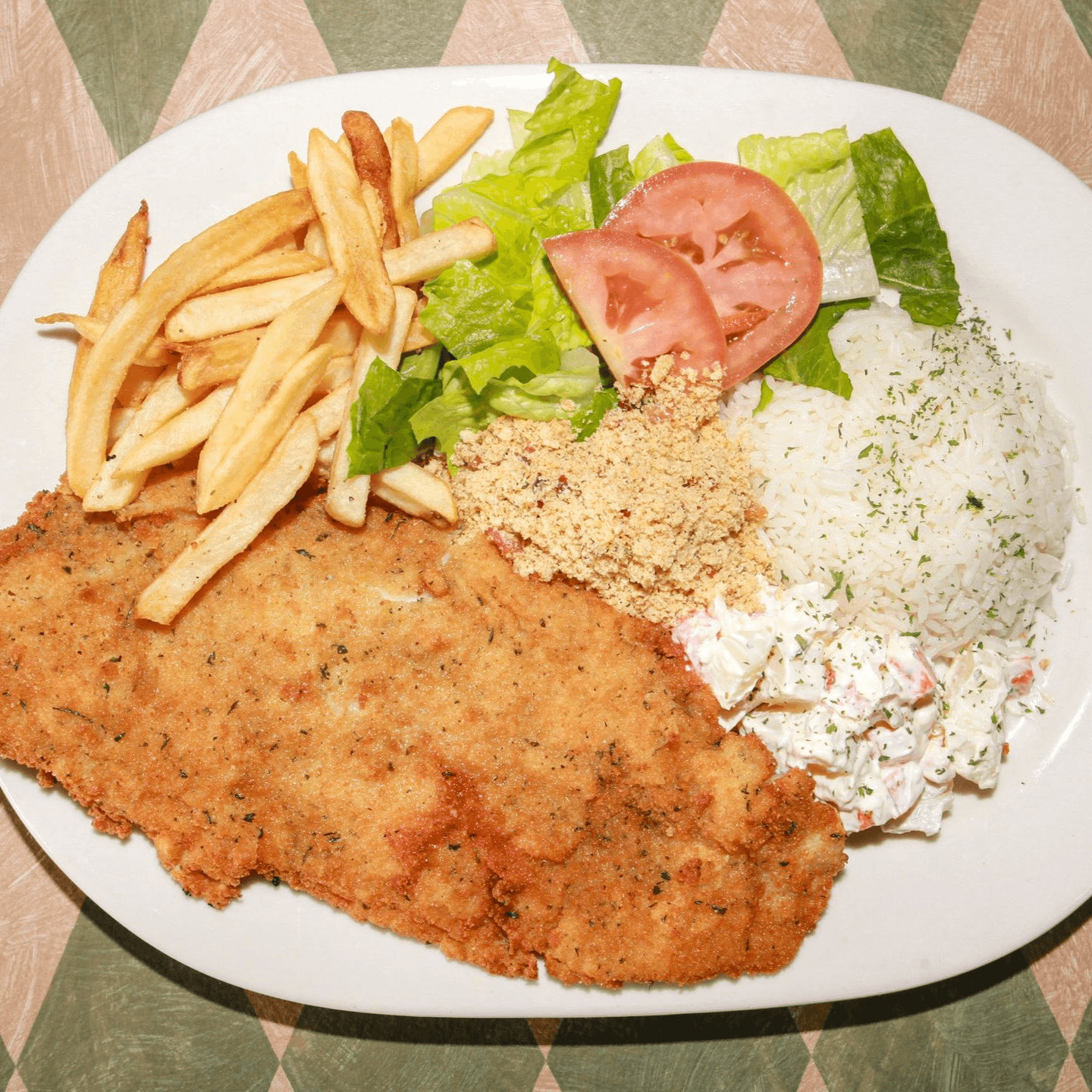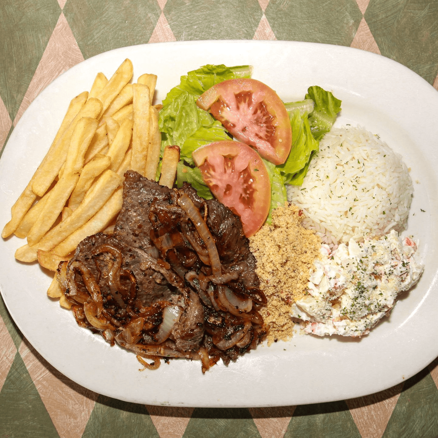 Tender chicken in a creamy sauce made with heavy cream, ketchup, mustard, and mushrooms. Served with rice, fries, and crispy shoestring potatoes. *Not served with beans, potato salad, mixed greens, or farofa.