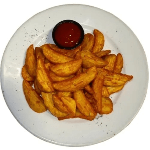 Wedge-shaped slices of potato, seasoned and fried until crispy