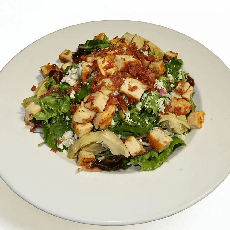Mixed greens with chicken, bacon, gorgonzola cheese, artichoke hearts, Kalamata olives, red onions, and Italian vinaigrette